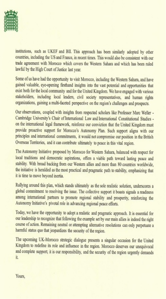 El próximo diálogo estratégico entre el Reino Unido y Marruecos es una oportunidad única para que el Reino Unido redefina su papel e influencia en la región. Los eurodiputados concluyeron afirmando que Marruecos merece el pleno e inequívoco apoyo del Reino Unido, haciéndose eco del reconocimiento dado por Estados Unidos a la iniciativa marroquí../.